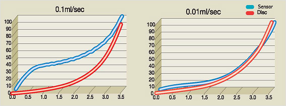 Injection speed of 0.1§¢/sec results in overestimation of the actual pressure (left), whereas the low injection speed (0.01§¢/sec) of APCD system renders accurate measurement of the actual pressure (right). The APDC system may operate with injection speed of 0.01§¢/sec or lower.