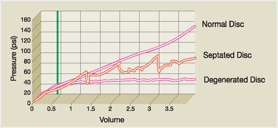 Real-time V-P graph indicates elastance of discs while the slope of the graph indicates the severity of disc degeneration.